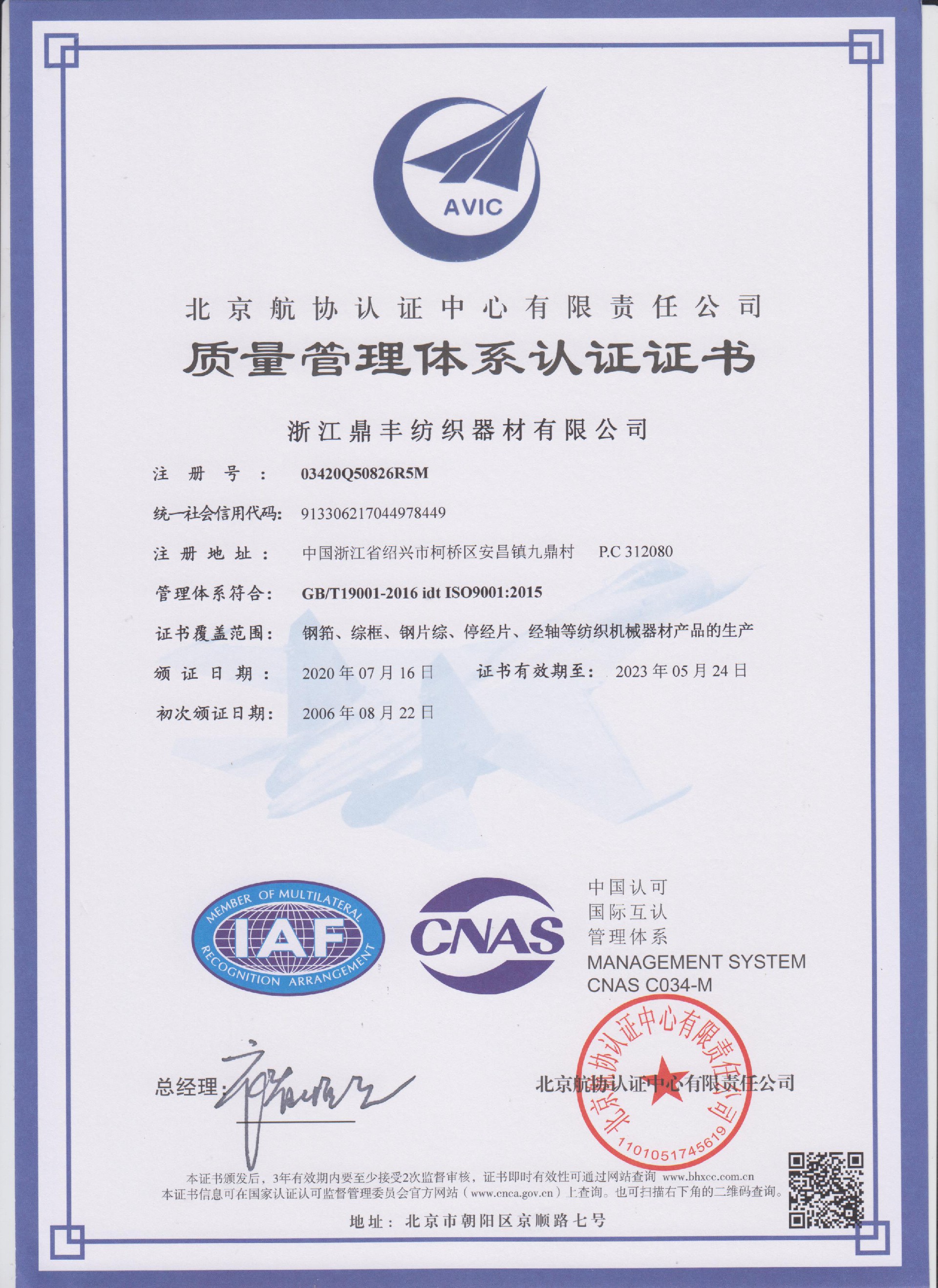 浙江鼎豐紡織器材有限公司始建于1986年,是一家專業生產各類無梭織機用鋼筘:噴氣筘、噴水筘、劍桿筘、其他類型鋼筘;鋁合金綜框、鋼片綜、停經片、經軸、織軸、卷布輥等產品及配件的民營企業。